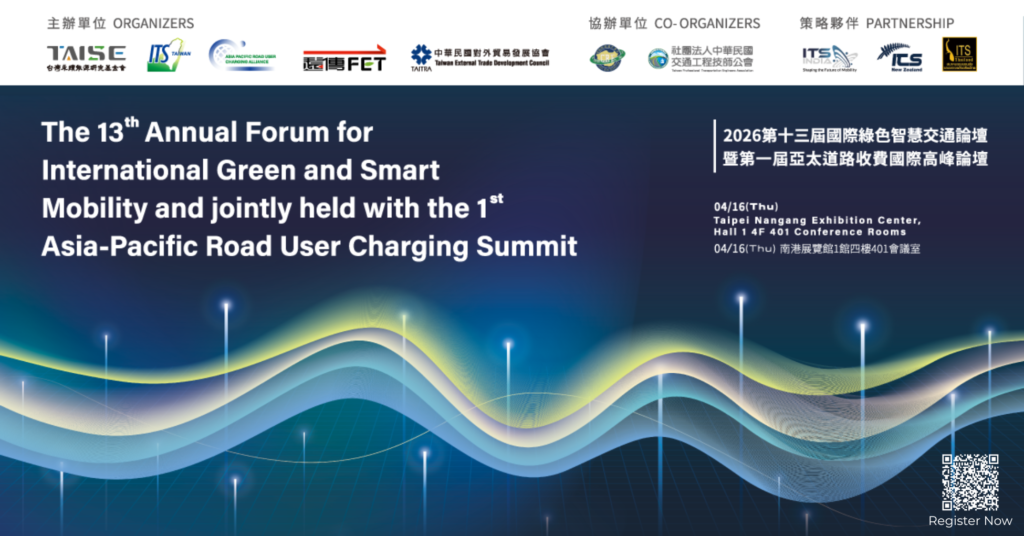 The 1st Summit of the Asia-Pacific Road User Charging Alliance (AP RUC Alliane)—established in March 2025 by ITS Taiwan, ITS Thailand, ITS New Zealand, and ITS India—will take place in Taipei on Thursday, April 16. The summit will be held as a co-located event alongside Taiwan’s 13th Annual Forum for International Green and Smart Mobility.